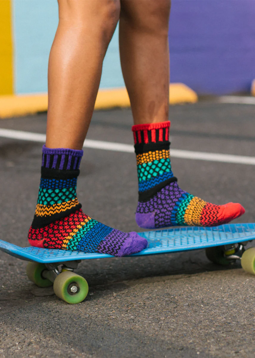 Go beyond the rainbow in a pair of these pretty black and rainbow mismatched socks. Their dark pattern works perfectly with black shoes, or wear them around the house to liven up your legs! Their thick cozy knit is perfect for every kind of weather, especially those times after a storm when the sun comes out.